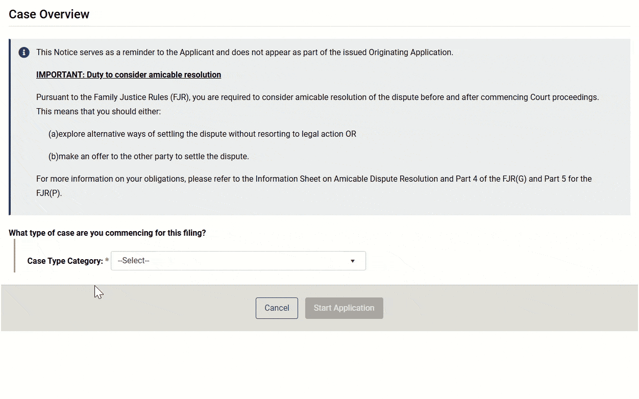 You will need to select a Case Type category and the corresponding Case Type document before you can start an application.