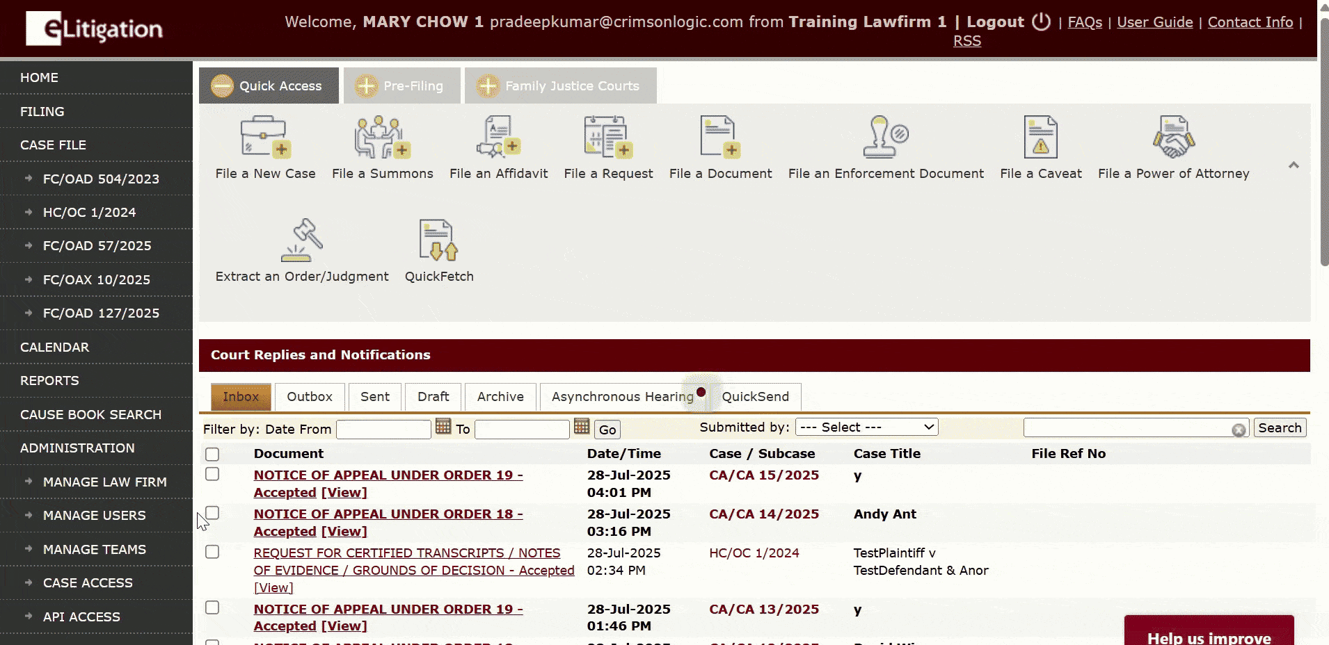 If you are not receiving court correspondences / notifications, do check that the email address in the case file is correct. If the email address is inaccurate or outdated, you will need to file a Notice of Change of Particulars (“NOC”). After the NOC is approved, the updated email address will be reflected in the case file.